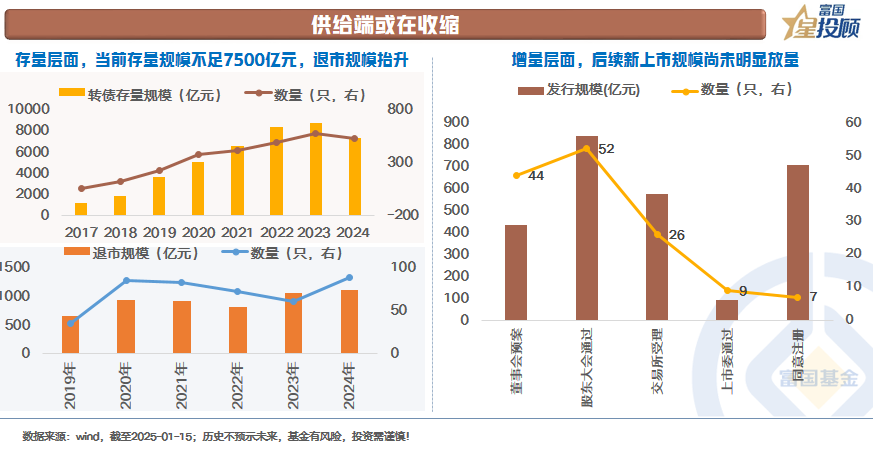 这一趋势体现在存量和增量两个方面。存量上,可转债规模呈现回落趋势,截至2024年底,当前可转债存量规模不足7500亿元。从退市情况来看,可转债退市规模逐年上升,2025年仍将有近50只可转债到期。此外,由于可转债可能在到期前发生转股、赎回和回售,实际退市规模可能会更多。增量上,短期内难以看到明显放量。截至2025年1月14日,仅有7只可转债已获注册通过,9只通过上市委审核,预计均能在2025年完成注册。考虑到股东大会通过和交易所受理情况,2025年可转债市场供给量将在50只左右,尚未出现明显放量。