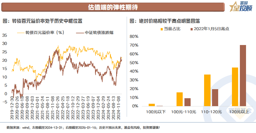 对于可转债而言,行情的触发点仍在于正股。对于2025年的A股市场,市场充满期待。这种期待的背后有着坚实的逻辑支撑。一方面,当前A股估值仍处于历史中枢偏低的位置,估值抬升仍有空间。另一方面,当前市场并未充分反映预期的积极面,而一旦这些积极面出现,市场行情将值得期待。海外方面,特朗普的政策主张全面落地并非易事,其“既要、又要、还要”的政策主张与“强美元、低利率、制造业回归”之间存在逻辑上的矛盾。国内方面,经济数据已呈现出边际上的改善,特别是地产领域,随着政策发力,市场企稳的迹象逐渐显现。