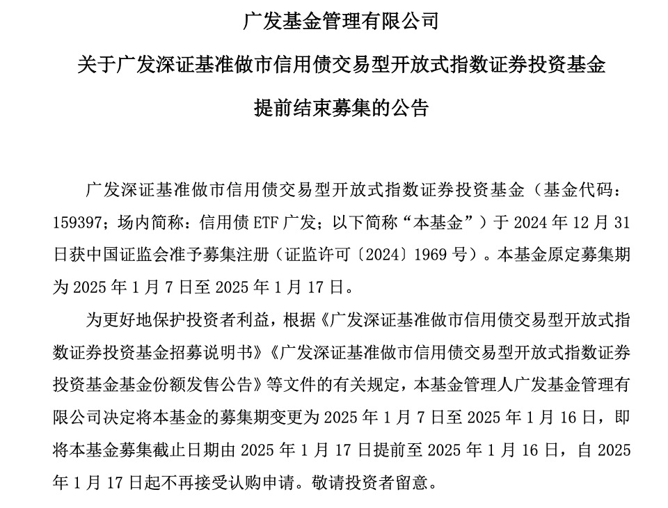 1月16日晚间,广发基金率先发布公告,宣布其旗下的广发深证基准做市信用债ETF提前结束募集,募集截止日从原定的1月17日提前至1月16日,以更好地保护基金份额持有人利益。同日,天弘基金也发布公告,宣布其天弘深证基准做市信用债ETF因认购申请超过募集规模上限30亿元,将对有效认购申请采取“末日比例确认”方式。