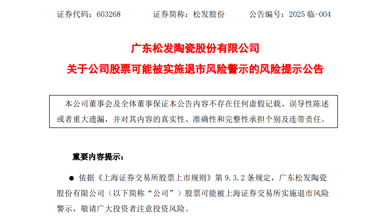因此,松发股份补充公告称,公司股票在2024年年度报告披露后或将被实施退市风险警示,即在公司股票简称前添加“*ST”。若2024年度经审计的扣非后净利润和营业收入触及相关标准,公司股票将从年报披露日起停牌,上交所将在停牌后5个交易日内,视实际情况对公司股票实施退市风险警示。