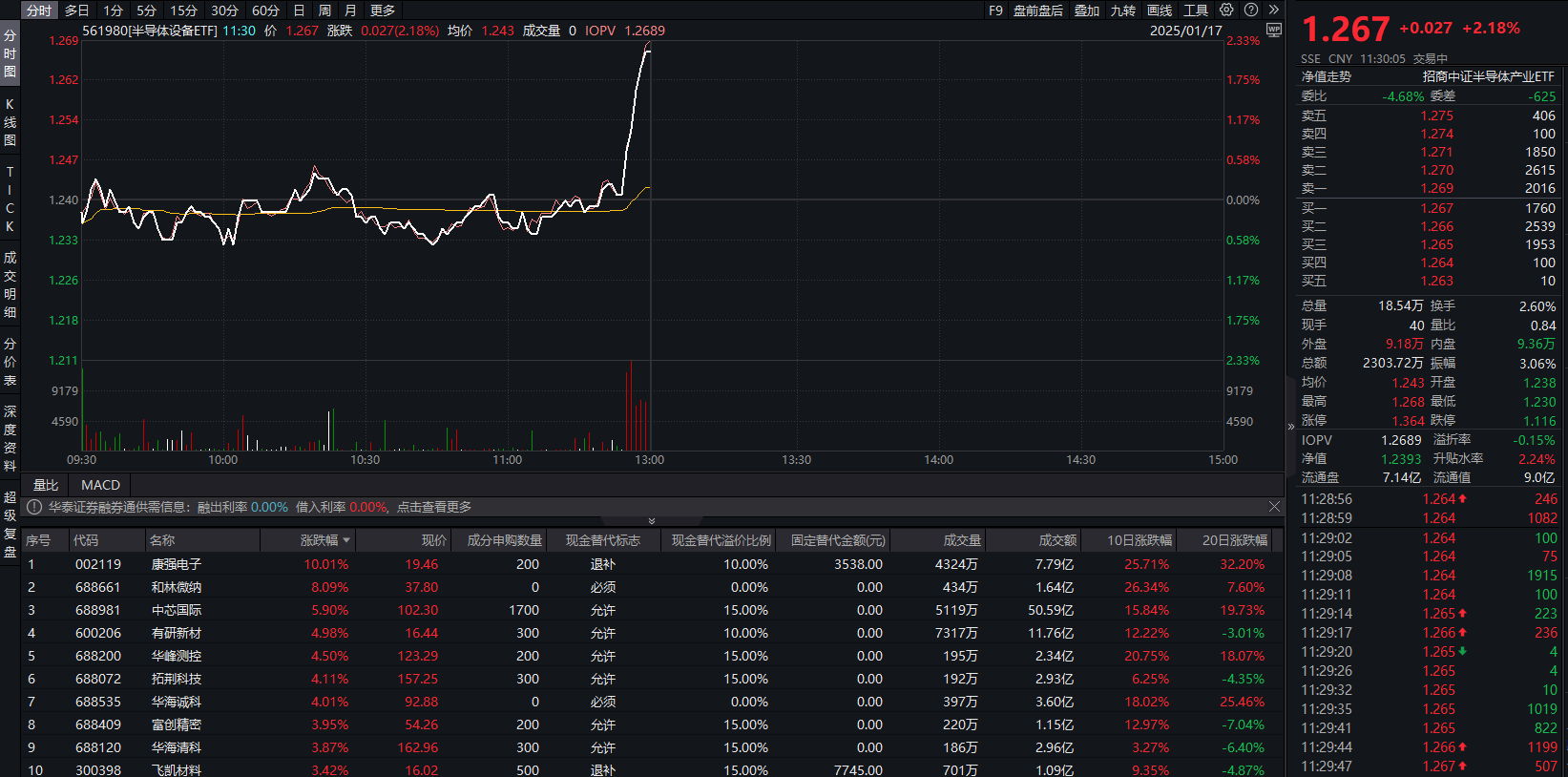 在相关ETF方面,截至午间收盘,半导体设备ETF(代码:561980)的涨幅达到了2.18%。具体来看,成分股中康强电子涨停,和林微纳的涨幅超过了8%,中芯国际上涨5.9%,而有研新材、华峰测控、拓荆科技等股票的涨幅也位居前列。此外,该ETF的换手率达到了2.6%,成交额超过了2300万元。