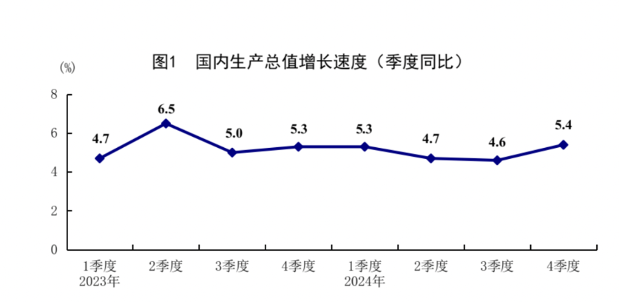 据初步核算,2024年我国国内生产总值(GDP)达到了约134.91万亿元,同比增长5.0%。分季度观察,一季度GDP同比增长5.3%,二季度为4.7%,三季度4.6%,四季度则强劲回升至5.4%。这一数据标志着我国经济总量首次突破130万亿元大关,稳居世界第二位,彰显出我国经济实力和综合国力的显著提升。