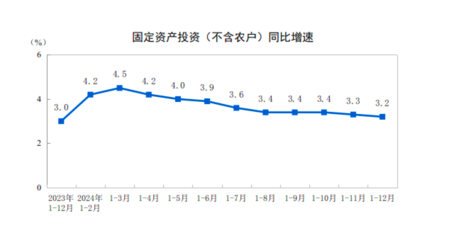 投资方面,2024年全国固定资产投资(不含农户)比上年增长3.2%,其中民间固定资产投资略有下降。在“两重”建设和大规模设备更新的带动下,基础设施投资和设备工器具购置投资均实现增长。