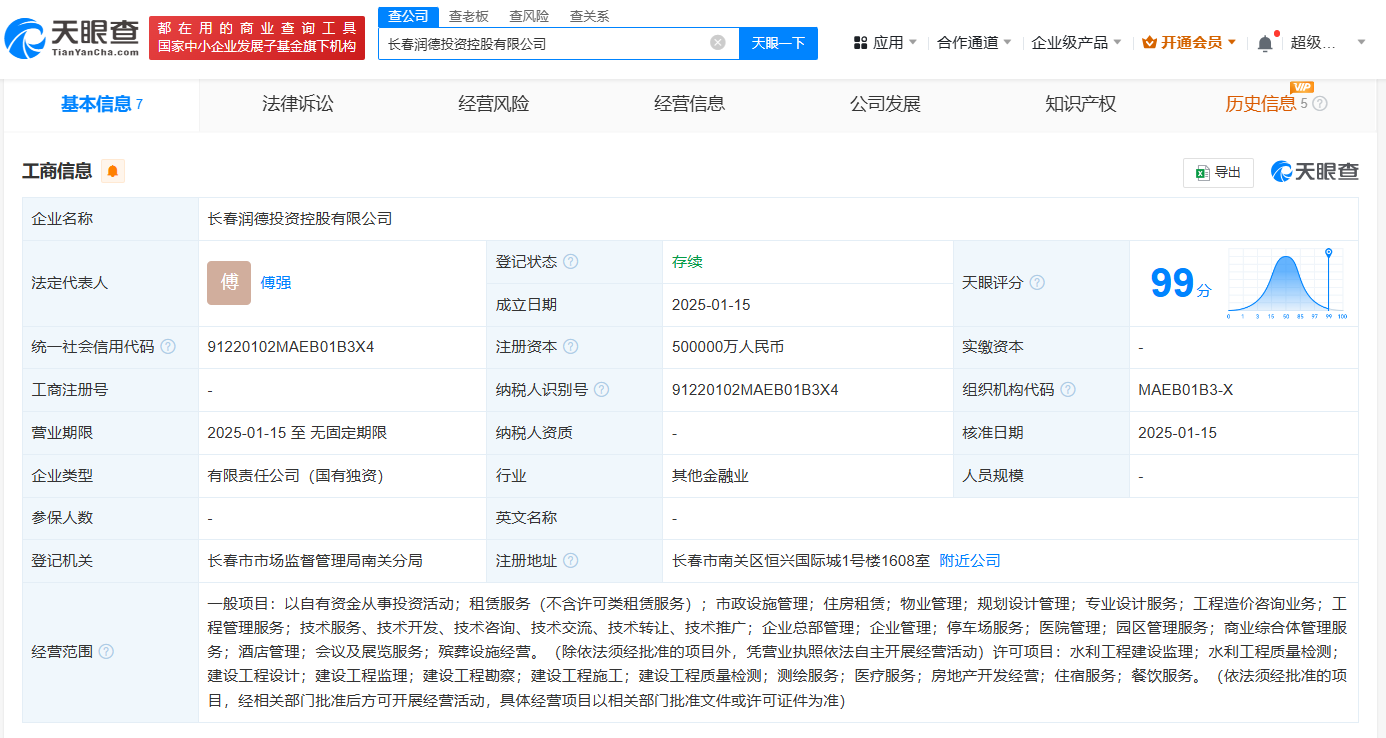 近日,长春润德投资控股有限公司正式成立,注册资本为50亿人民币,经营范围包括投资活动、市政设施管理、住房租赁等,由长春市人民政府国有资产监督管理委员会全资持股。