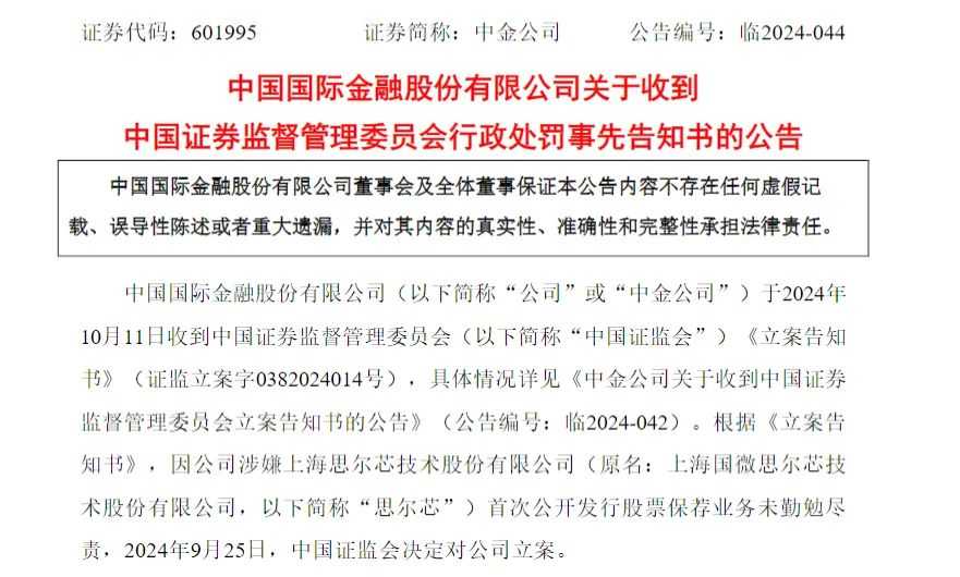从立案到行政处罚告知,中金公司仅耗时一个月。10月11日晚间,中金公司公告称因思尔芯IPO保荐业务未勤勉尽责被证监会立案。10月26日晚间,公司再次公告称已收到证监会的《行政处罚事先告知书》。