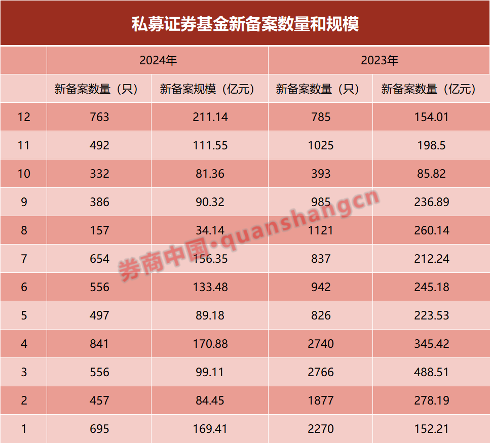 此外,2024年私募证券基金的新发行数量和规模均大幅下滑,反映了行业募资的艰难。然而,在年底之际,新备案证券私募的数量和规模均创下年内新高,显示出行业募资环境有所回暖。