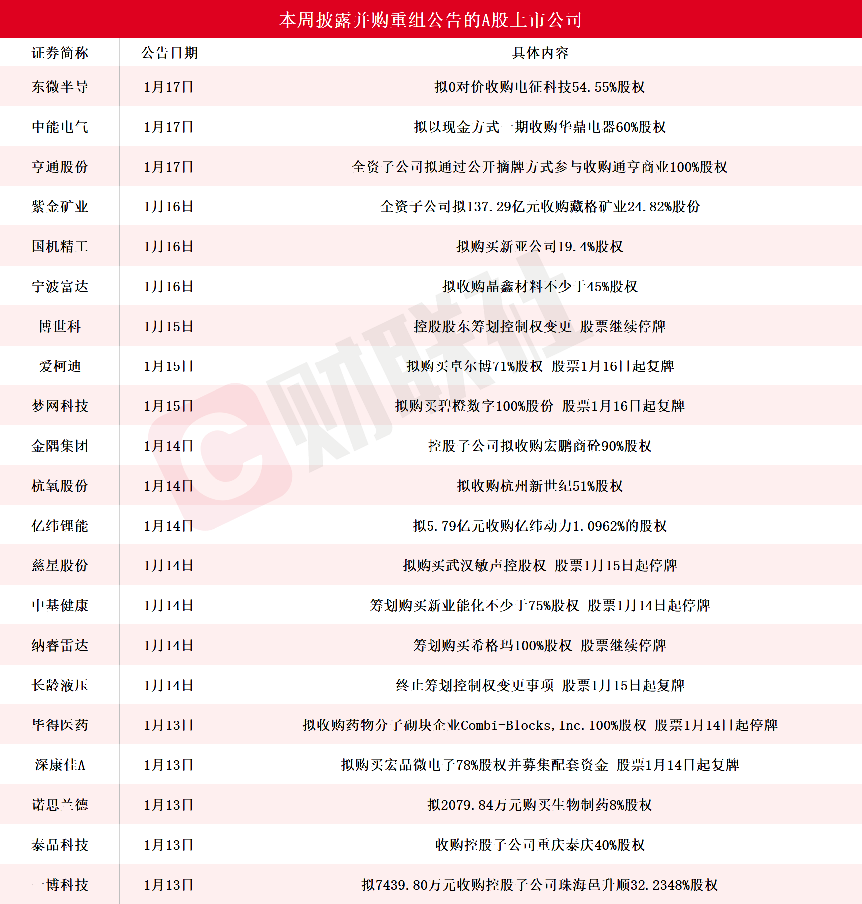 据财联社不完全统计,截至本周,已有21家A股上市公司披露了并购重组进展,包括东微半导、中能电气、亨通股份、紫金矿业、国机精工、宁波富达、博世科、爱柯迪、梦网科技、金隅集团、杭氧股份、亿纬锂能、慈星股份、中基健康、纳睿雷达、长龄液压、毕得医药、深康佳A、诺思兰德、泰晶科技、一博科技等。这些公司的并购重组计划涵盖了多个领域,为市场注入了新的活力。