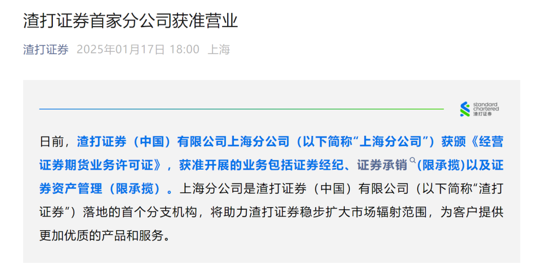 与此同时,另一家外资券商渣打证券(中国)有限公司也传来好消息。近日,渣打证券(中国)有限公司上海分公司获颁《经营证券期货业务许可证》,获准开展的业务包括证券经纪、证券承销(限承揽)以及证券资产管理(限承揽)。这是2025年以来首家外资券商在华获准营业的分支机构。
