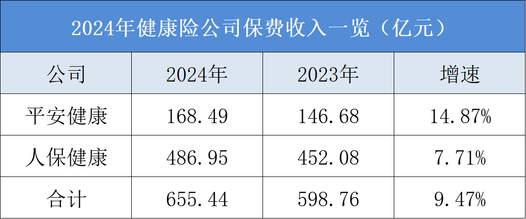 两家专业健康险公司中,人保健康2024年全年累计保费收入为486.95亿元,同比增长7.71%;平安健康累计保费收入为168.49亿元,同比增长14.87%。