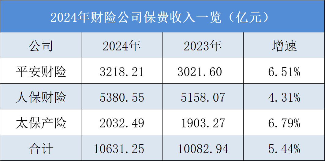 在财险方面,财险“老三家”(人保财险、平安财险和太保产险)2024年合计实现保费收入10631.25亿元,同比增长5.44%。