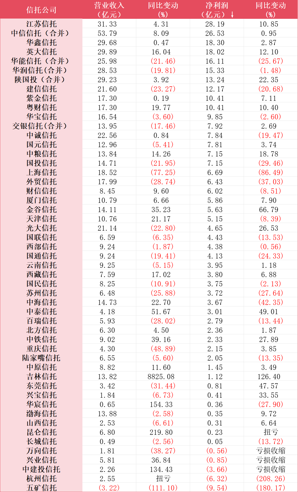中信信托以53.79亿元的营收水平位居首位,成为唯一营收突破50亿元的信托机构。而江苏信托则以28.19亿元的净利润摘得“榜一大哥”头衔,同比增长10.85%,净利润水平首次超过中信信托。这一增长主要得益于其投资江苏银行的股权收益,每年可创造约20亿元的投资收益。