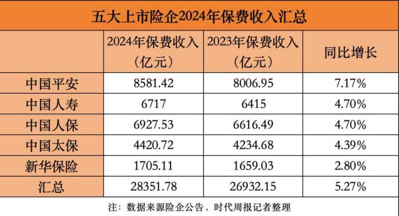 1月17日晚间,A股五大险企——中国平安、中国人寿、中国人保、中国太保以及新华保险,正式披露了2024年保费收入数据。据时代周报记者统计,这五家险企在2024年合计实现了2.84万亿元的原保费收入,同比增长5.27%,全部实现了正增长。