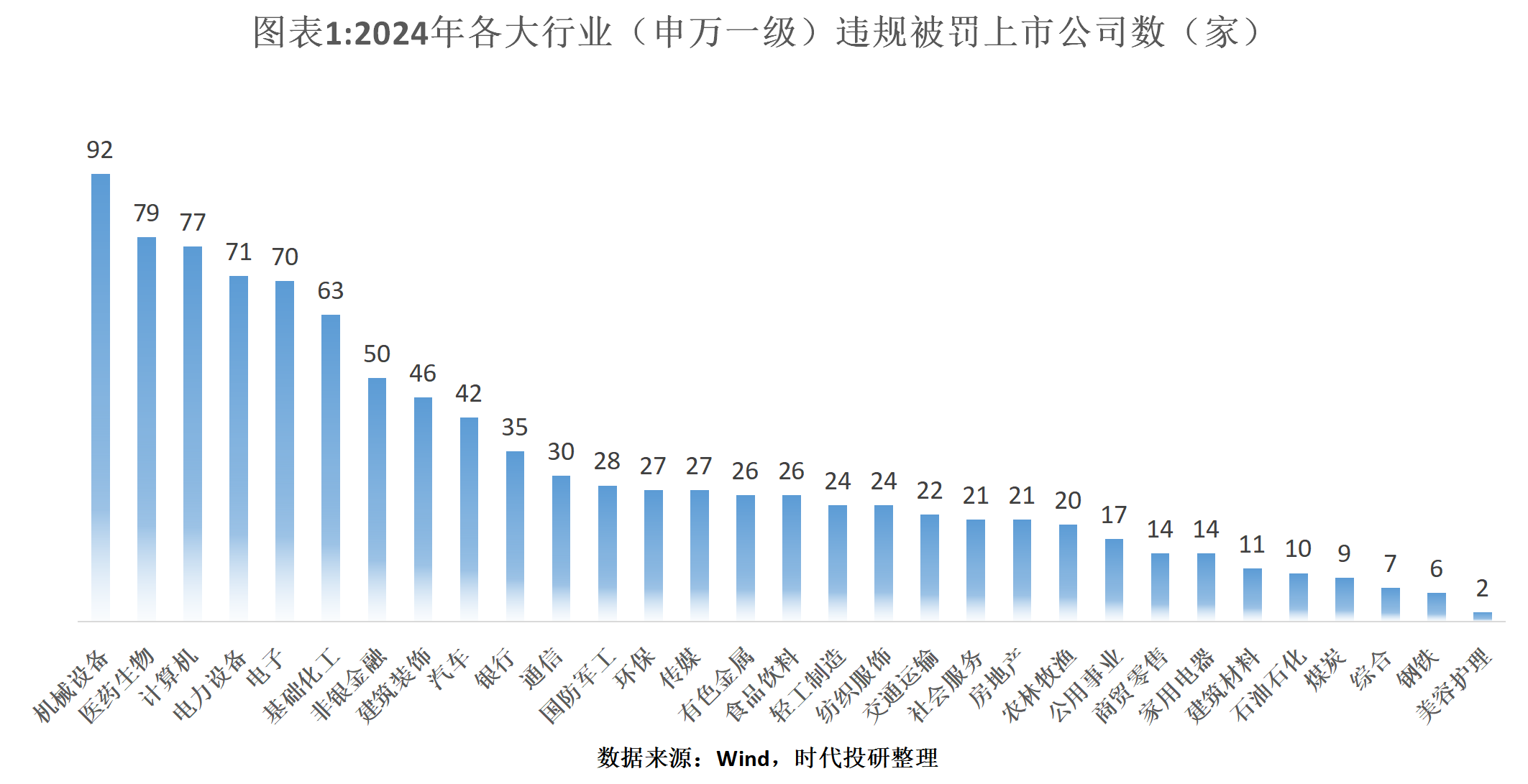 2024年,A股市场违规被罚的上市公司数量高达1011家,较2023年增长13%,占比提升至18.78%。机械设备、医药生物、计算机等行业成为违规“重灾区”,被罚公司数量分别位居前三。广东、江苏、浙江等地上市公司违规被罚数量较多。