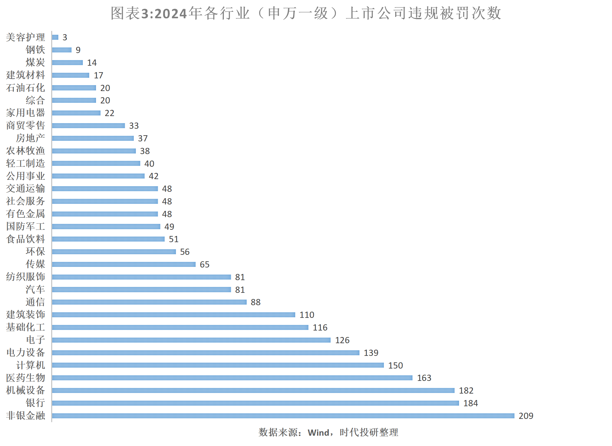 从违规被罚次数来看,2024年共计2289次,同比增长16%。非银金融行业以209次位居首位,银行、机械设备等行业紧随其后。金融业(包括非银金融和银行)被罚次数占比达到17.17%。