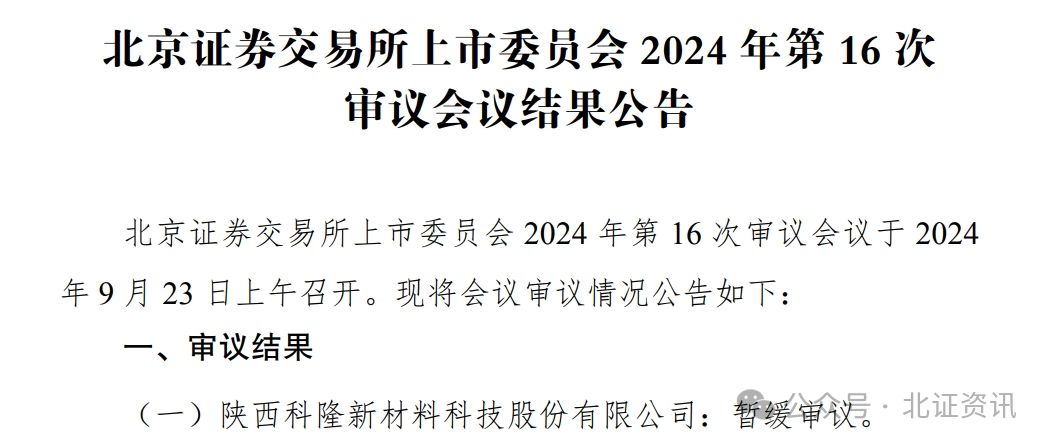 9月23日,北交所上市委员会发布2024年第16次审议会议结果,科隆新材IPO申请被暂缓审议,成为继天工股份后第二家遭遇此命运的拟北交所上市企业。同时,丰岛食品和格林司通两家公司宣布终止北交所上市进程并撤回申请文件。