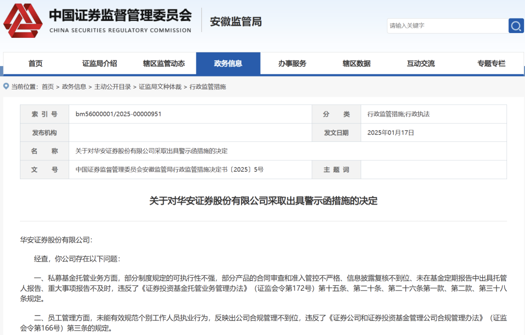 安徽证监局对华安证券出具警示函,私募基金托管业务及员工管理存漏洞