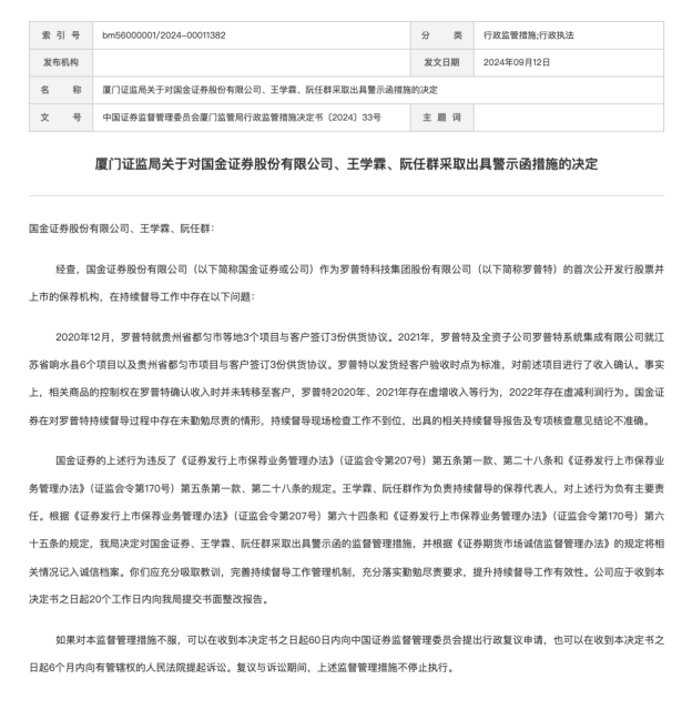 作为罗普特的保荐机构,国金证券在对罗普特持续督导过程中未勤勉尽责,现场检查工作不到位,相关报告及核查意见结论不准确。王学霖和阮任群作为保荐代表人,对此负有主要责任。厦门证监局对国金证券、王学霖和阮任群采取了出具警示函的监管措施,并将其记入诚信档案,要求公司在20个工作日内提交书面整改报告。