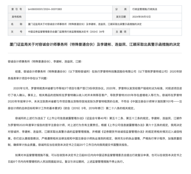 容诚会计师事务所作为审计机构,在2020年年报审计中未能关注到贵州省都匀市项目售出货物存放地实际为罗普特租赁的仓库,违反了相关规定。签字注册会计师李建彬、连益民和江颖对此负有主要责任。监管对容诚所、李建彬、连益民和江颖也采取了出具警示函的监管措施,并将其记入诚信档案,要求容诚所在20个工作日内提交书面整改报告。