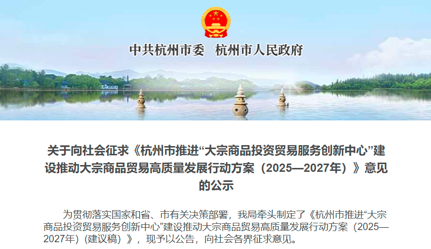 1月17日,杭州市商务局正式发布了关于《杭州市推进“大宗商品投资贸易服务创新中心”建设推动大宗商品贸易高质量发展行动方案(2025—2027年)》的公示,广泛征求社会各界意见。