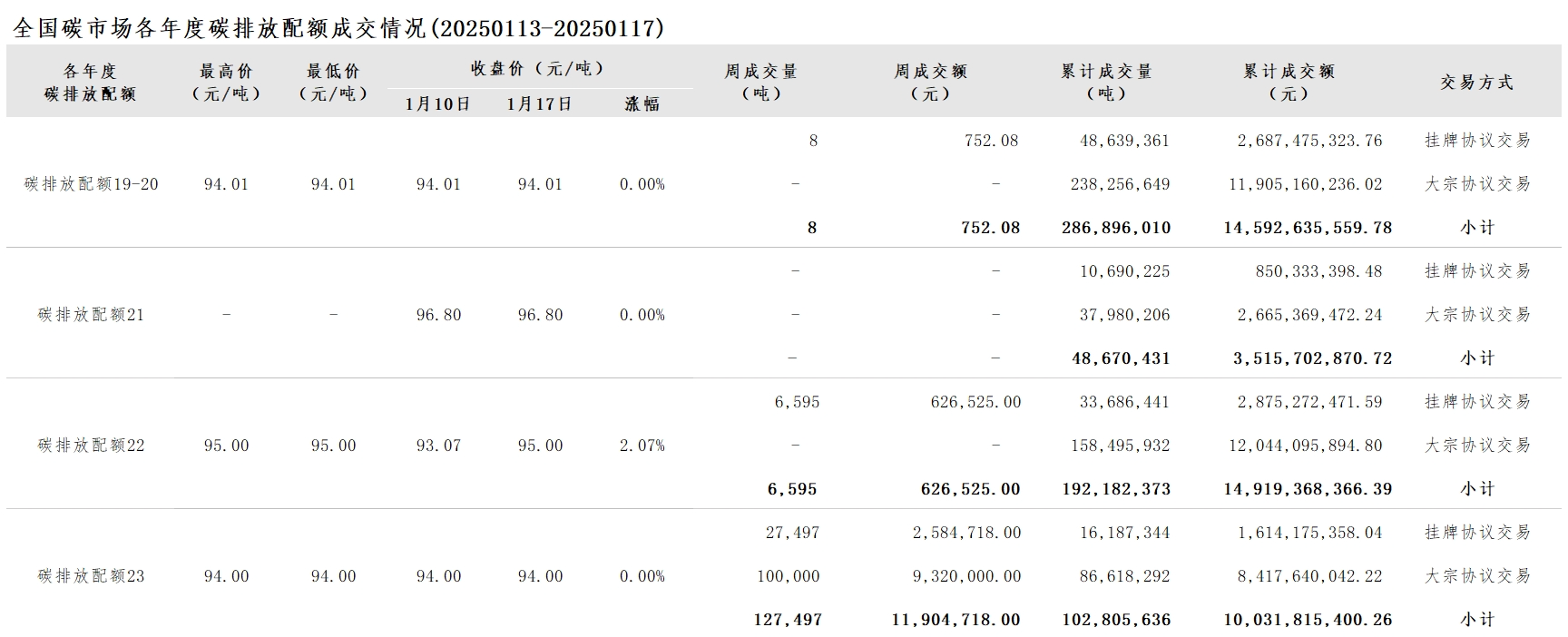 自2025年1月1日至1月17日,全国碳市场的碳排放配额成交量累计达到了285,786吨,成交额累计为26,795,093.64元。这一数据进一步展示了碳市场在2025年初的交易情况。