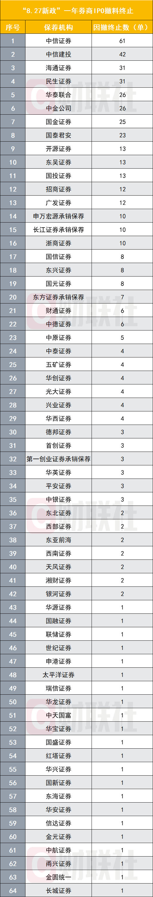 自“827新政”以来,共有484家公司终止IPO,其中479家因撤材料而终止。因撤材料终止IPO项目的券商有64家,其中中信证券、中信建投等券商撤否数量较多。