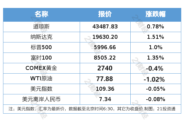 周五,纽约股市三大股指集体上涨,其中纳指涨幅超过1.5%。截至收盘,道琼斯工业平均指数收于43487.83点,较前一交易日上涨334.70点,涨幅为0.78%,周累涨3.69%;标准普尔500种股票指数收于5996.66点,上涨59.32点,涨幅为1.00%,周累涨2.91%;纳斯达克综合指数则收于19630.20点,上涨291.91点,涨幅为1.51%,周累涨2.45%。此外,欧洲三大股指也全线上涨,英国富时100、法国CAC40和德国DAX指数分别上涨1.35%、0.98%和1.20%。然而,国际油价在当天出现下跌,纽约商品交易所轻质原油期货价格和伦敦布伦特原油期货价格分别下跌1.02%和0.62%。