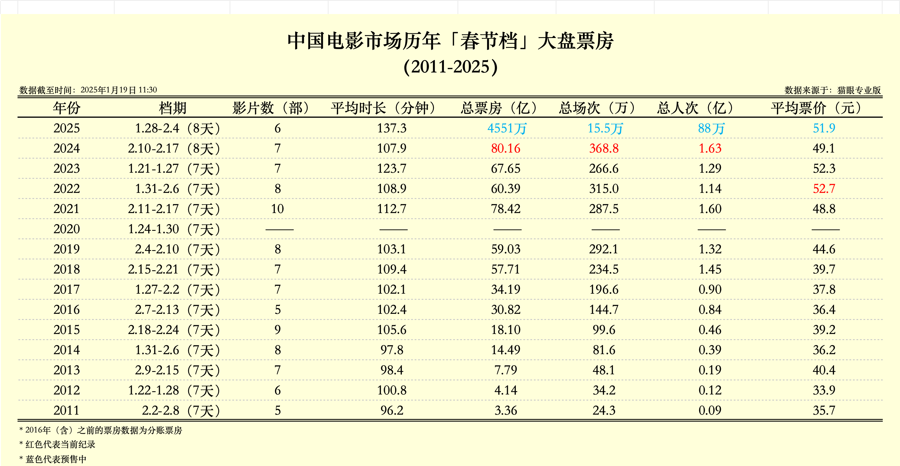 “长”则体现在档期时间的延长和电影时长的增加。由于今年春节与去年一样多放一天假,春节档计入票房的天数达到8天。此外,除了《熊出没·重启未来》外,其余5部新片时长均超过两个小时,平均时长达到137.3分钟,创下了春节档的新纪录。