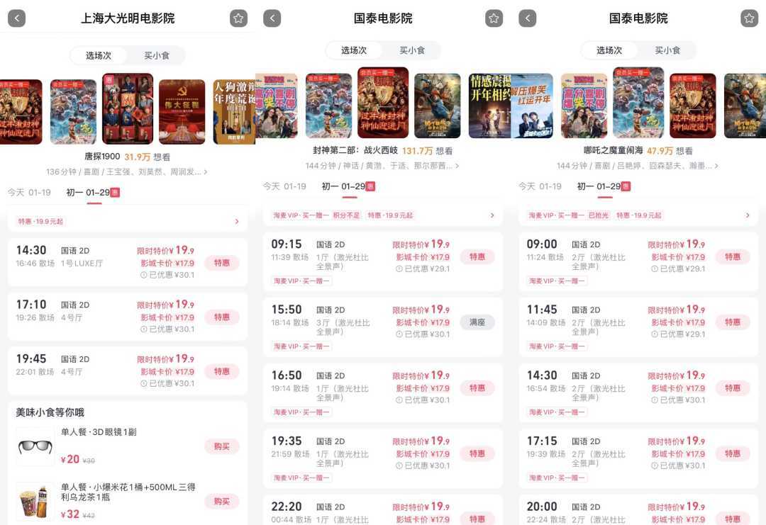 财联社记者在淘票票、猫眼等购票平台上发现,不少新片在初一(1月29日)场次推出了19.9元的特价票。这些优惠活动通常由片方拿出发行预算进行促销,旨在提升观影人数。