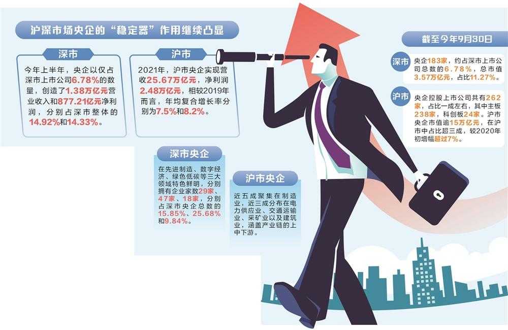 作为国民经济的支柱,央企的经营韧性得到了充分体现。同时,央企的科创实力也在稳步提升。沪深市场的央企继续发挥着“稳定器”的作用。今年上半年,央企以仅占深市上市公司6.78%的数量,创造了1.38万亿元的营业收入和877.21亿元的净利润,分别占深市整体的14.92%和14.33%。2021年,沪市央企实现营收25.67万亿元,净利润2.48万亿元,与2019年相比,年均复合增长率分别为7.5%和8.2%。