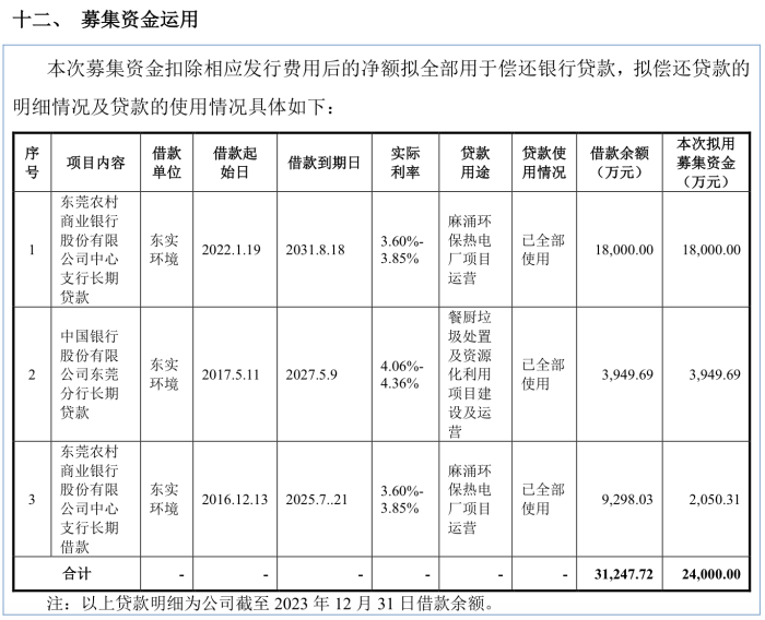 基于偿债压力,东实环境此次IPO拟募资2.4亿元,全部用于偿还银行贷款。其中包括东莞农村商业银行股份有限公司中心支行的长期借款9298.03万元(计划偿还2050.31万元),中国银行股份有限公司东莞分行的长期贷款3949.69万元(计划全部偿还),以及东莞农村商业银行股份有限公司中心支行的1.8亿元长期贷款(有意结清)。