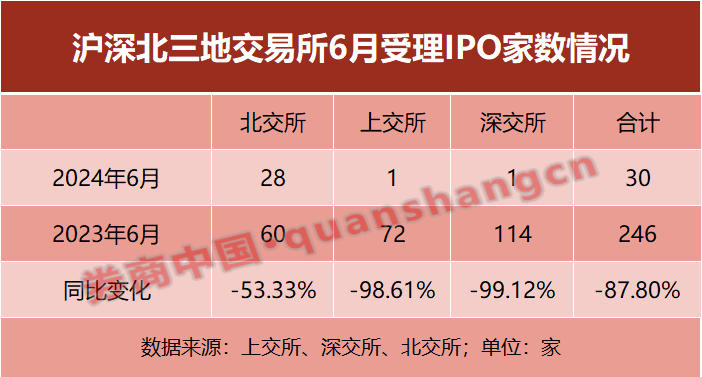 6月份IPO申报潮的降温尤为引人注目。当月沪深北三地交易所合计受理的IPO企业数量仅为30家,同比去年同期减少了88%。其中,北交所受理的企业数量虽然最多,但与去年同期相比也大幅下降。