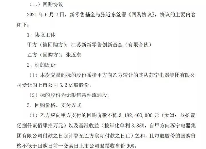 具体来看,6月2日晚间,苏宁易购发布公告称,苏宁电器集团与新零售基金签署《股份转让协议》,拟将持有的苏宁易购5.2亿股(占总股本5.59%)转让给新零售基金,转让价款总额为31.82亿元。新零售基金此次受让股权旨在为苏宁电器集团提供流动性支持,张近东承诺在明年4月1日前回购上述股权,回购价款不低于31.82亿元及基准收益。