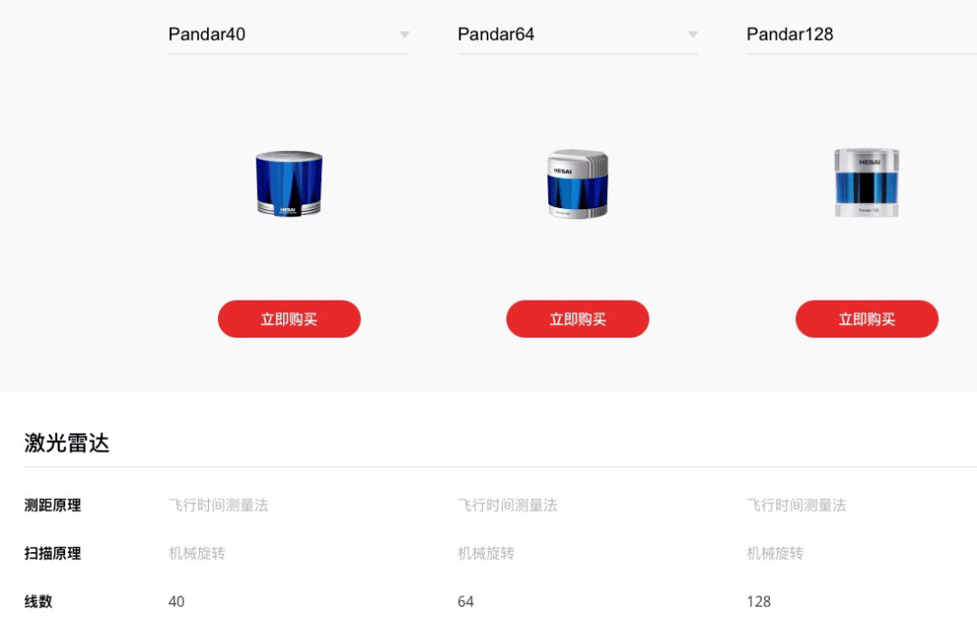 禾赛科技官网展示的三款激光雷达,线数分别为40、64和128,展示了其在激光雷达领域的领先技术。