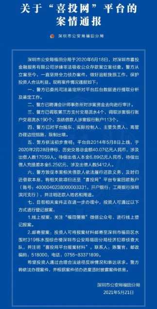 近日,深圳公安福田分局对P2P平台“喜投网”的案情进行了详细通报。据悉,该平台自2020年6月18日起便因涉嫌非法吸收公众存款案被深圳警方立案侦查。自立案以来,警方始终致力于案件的全力侦办,积极追赃挽损,以切实保护投资人的合法权益。此次通报揭示了以下关键信息: