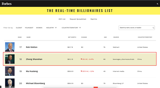 尽管农夫山泉股价下滑,但并未影响钟睒睒的中国首富地位。根据3月29日福布斯实时富豪榜,钟睒睒资产净值约为612亿美元(约合人民币4015亿元),在全球富豪中位列第18名。尽管其身价较最高时缩水超过两千亿元人民币,但仍稳坐中国首富宝座,紧随其后的是马化腾,资产净值约为598亿美元。