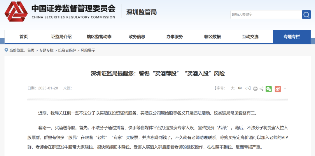 深圳证监局警示:“买酒荐股”“买酒入股”诈骗频发,投资者需谨慎