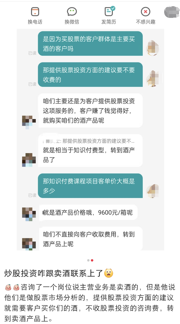 记者注意到,近期市场上关于这两类诈骗手段的分析和受骗案例分享屡见不鲜。例如,有求职者在网上分享了自己的求职经历,对方声称提供股票投资服务,实则将费用转移到高价酒产品上,每箱售价高达9600元,美其名曰“知识付费”。此外,还有投资者揭露了自己“买股票服务送珍藏白酒”的上当经历,广告中声称的稀有年份白酒和诱人的股票服务承诺最终化为泡影。