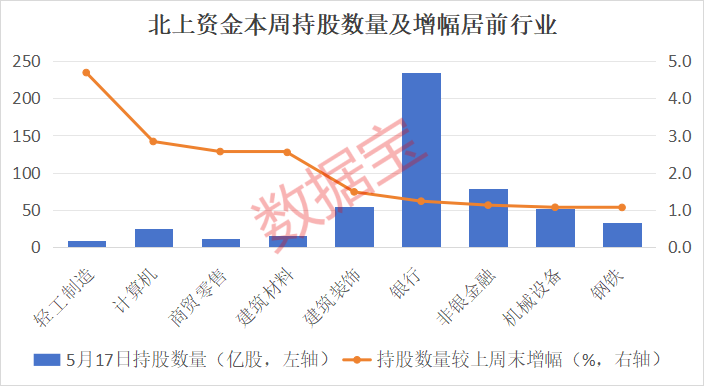 据证券时报·数据宝统计,5月13日至5月17日这一周,北上资金加仓了21个申万一级行业。在剔除持股数量低于5亿股的行业后,有9个行业的持仓数量环比增加超过1%。