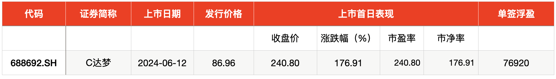 此外,本周暂无新股上市安排。但上周三,国产数据库第一股达梦数据(688692.SH)在科创板上市,中一签最高盈利超11万元,成为年内第二大肉签。