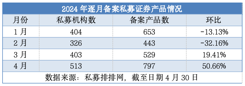 4月份,私募证券产品备案数量激增,创下了年内新高。根据私募排排网的数据,截至4月30日,共有513家私募机构在当月合计备案了797只私募证券产品,环比增长了50.66%。这一增长趋势已经持续了两个月,无论是备案私募证券产品的机构数量还是产品数量,都呈现出连续增长的态势。