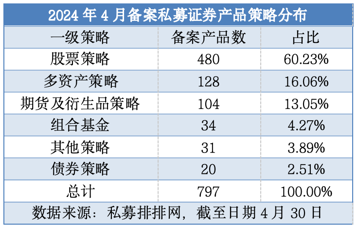 在备案的产品中,股票策略产品成为了主力军。数据显示,4月份备案的股票策略产品达到了480只,占比高达60.23%。紧随其后的是多资产策略和期货及衍生品策略,分别备案了128只和104只产品,占比分别为16.06%和13.05%。这两大策略因其与股票市场的低相关性、期货市场的强流动性以及丰富的期货策略,受到了投资者的广泛关注。相比之下,组合基金和债券策略产品的备案数量较少,分别占比4.27%和2.51%。