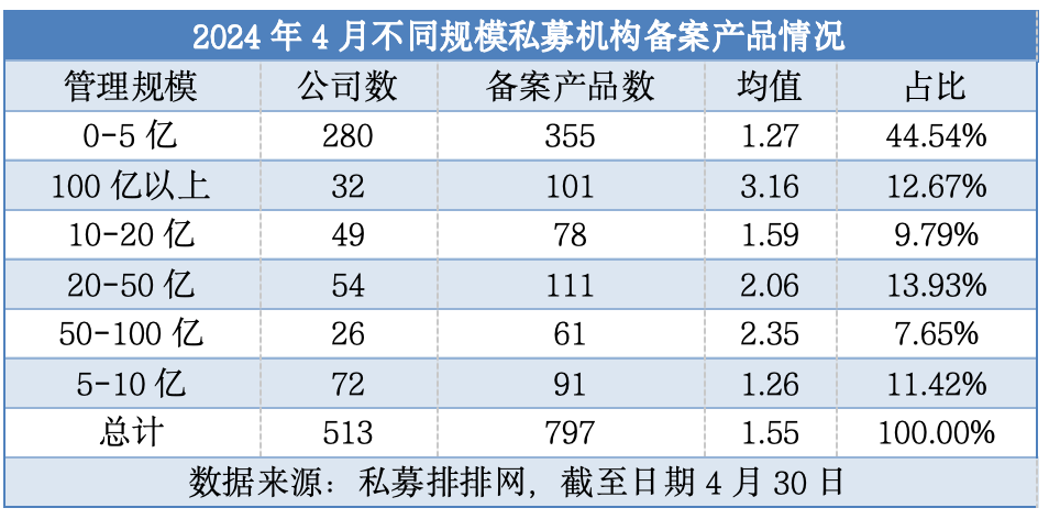 从规模上看,小私募合计备案产品数量领先,但大私募平均备案产品数量更高。数据显示,规模在0-5亿元的私募机构合计备案了355只产品,占比44.54%。而规模在100亿元以上的私募机构虽然数量不多,但合计备案了101只产品,平均每家大私募备案产品3.16只。此外,百亿量化私募在备案产品方面更具优势,4月份备案产品数量在2只及以上的私募机构中,有6家量化私募机构备案产品数量在6只及以上,其中5家管理规模在100亿元以上。