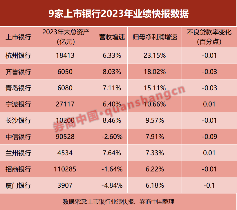 首批业绩快报同样传递出积极信号。截至目前,已有9家A股上市银行发布了2023年业绩快报。据梳理,这9家上市银行的净利润同比增速普遍实现了正增长,增长幅度在6%至24%之间。其中,杭州银行、齐鲁银行、青岛银行和宁波银行4家银行的归母净利润同比增长均超过10%,杭州银行甚至同比增长23.15%,维持了近年来的高增速。资产质量方面,除了兰州银行和宁波银行的不良贷款率较上年末有轻微上升外,其余7家银行均实现了不良率下降。