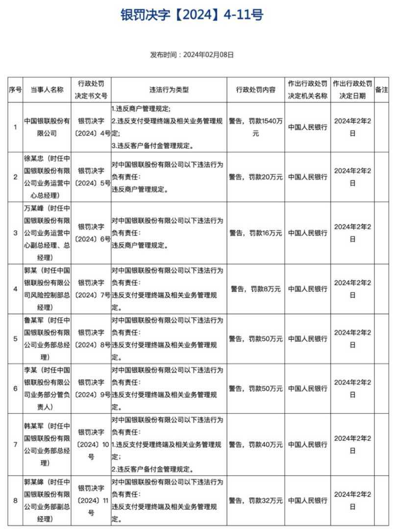 2024年2月,中国银联因违反商户管理规定等多项违规行为被央行罚款1540万元,并有多位负责人被罚。银联回应将严格落实整改要求,推动支付产业高质量发展。同时,银联商务也因违规被罚,凸显央行对支付行业监管趋严。