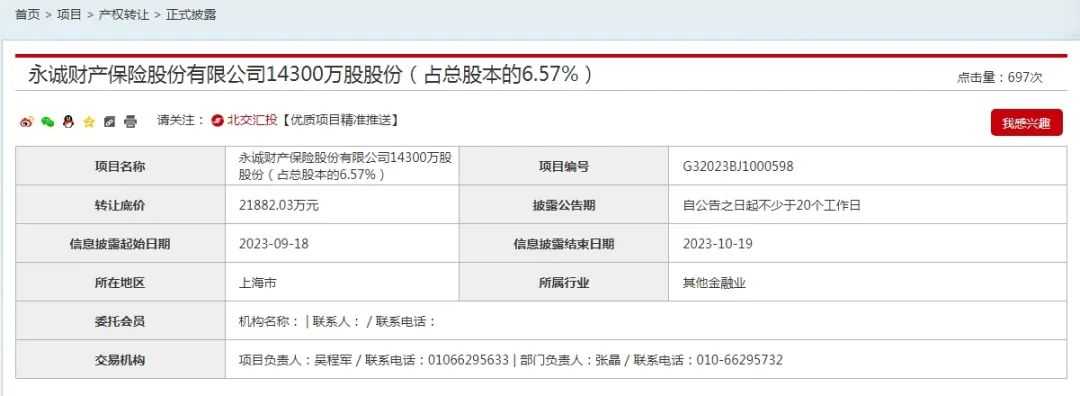 新三板挂牌险企永诚财产保险股份有限公司(下称“永诚财险”)股权再度挂牌转让。