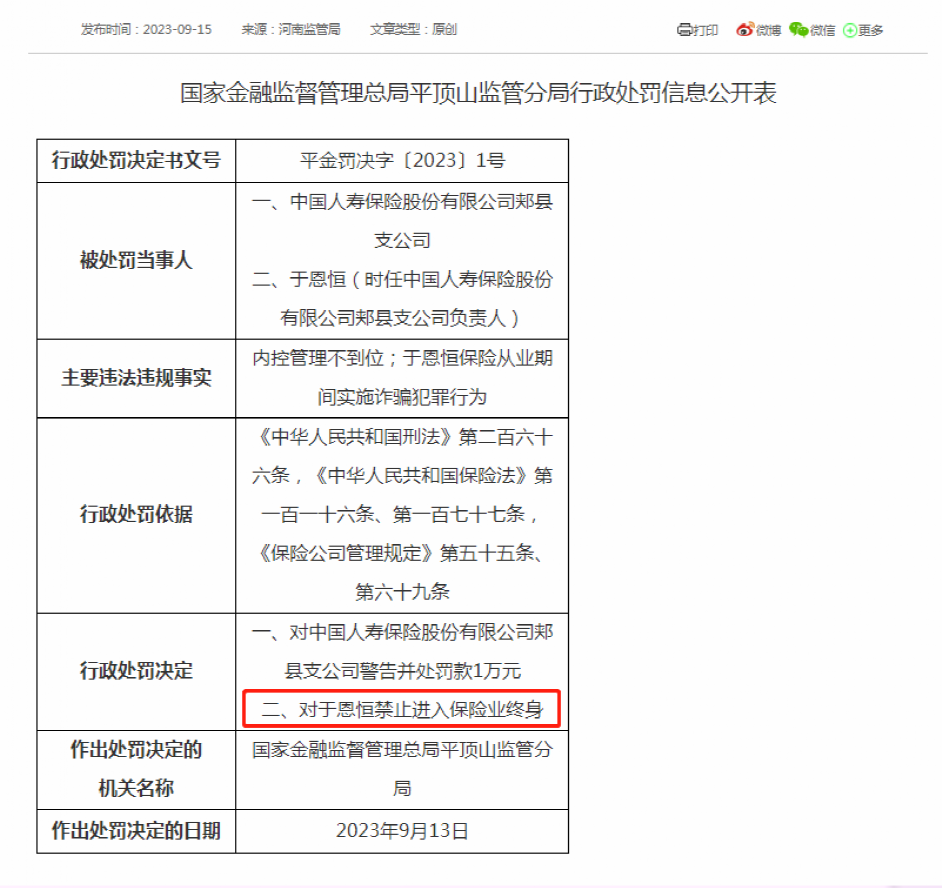 9月15日,国家金融监督管理总局平顶山监管分局对此案进行了公开处理。行政处罚信息显示,中国人寿保险股份有限公司郏县支公司因内控管理不到位,被处以警告并罚款1万元的处罚。同时,对于恩恒个人,则作出了终身禁止进入保险业的严厉决定。