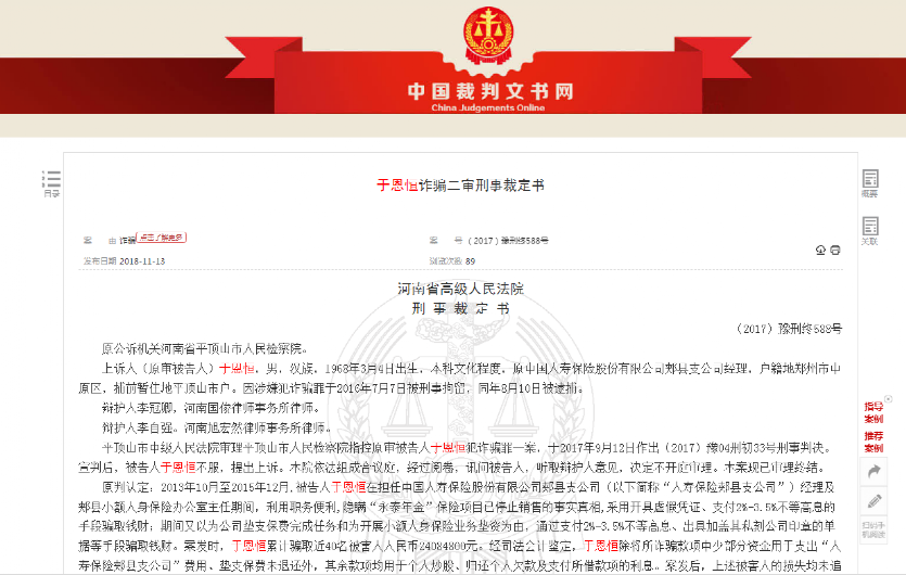 中国人寿保险郏县支公司原负责人诈骗案被重罚