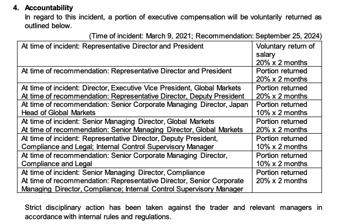野村控股的困境始于周四,公司发布声明称,因非法交易日本国债期货受到日本监管机构的处罚。作为处罚的一部分,野村控股首席执行官奥田健太郎自愿返还了部分薪酬,具体为两个月内各20%的薪资,而其他相关部门领导也按照类似或更小的比例进行了薪酬返还。