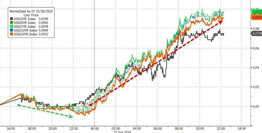 而周一的美债市场似乎也在一定程度上印证了Husain的大胆预言。各期限美债收益率普遍出现了两位数的大涨行情,尽管类似的场景在美联储9月降息后已经频繁出现,但周一市场的波动之大仍然令人震惊。