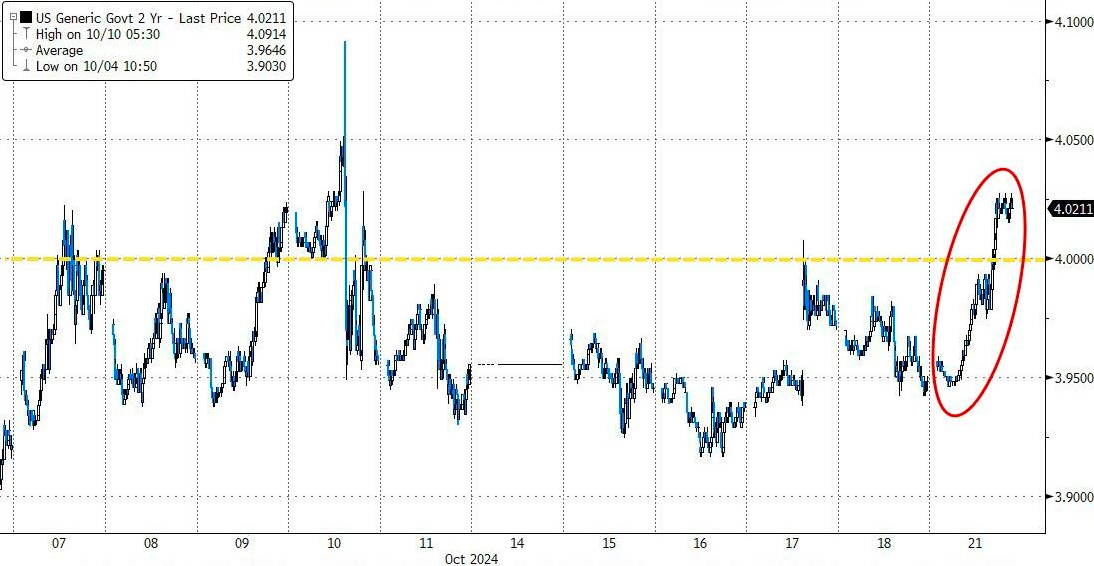行情数据显示,截止周一纽约时段尾盘,各期限美债收益率普遍大幅走高。其中,2年期美债收益率涨8.1个基点报4.044%,5年期美债收益率涨11个基点报3.998%,10年期美债收益率涨11.3个基点报4.205%,30年期美债收益率涨10.8个基点报4.505%。与美联储利率预期关联紧密的2年期美债收益率,目前已紧随10年期美债收益率的脚步,重返4%关口上方。